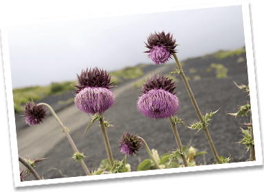 Đó là cúc gai Phú Sĩ (Fujiazami). Cúc gai là một trong những loại thực vật xuất hiện đầu tiên trên hoang mạc núi lửa bao phủ dung nham nên giống như tiên phong hình thành nên rừng cây. Dazai Osamu viết rằng “Phú Sĩ trông y hệt hoa nguyệt kiến thảo” nhưng nguyệt kiến thảo là loài thực vật du nhập. Vì vậy mặc dù về văn học nghe rất hay nhưng với chúng tôi thì núi Phú Sĩ không phải là nguyệt kiến thảo mà là cúc gai Phú Sĩ.
