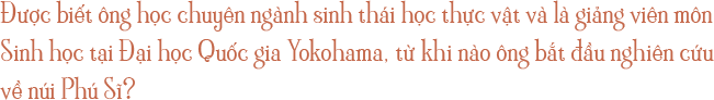 Đó là khi tôi quyết định làm đề tài luận án tốt nghiệp “Thảm thực vật của núi Phú Sĩ”. Nghiên cứu đầu tiên được tiến hành vào tháng 5 của năm hai đại học, cũng là lần đầu tiên tôi một mình leo lên núi Phú Sĩ, khoảng năm 1965. Xe buýt đi đến National Chuo Youth Friendship Center ở Gotemba, từ đây tôi vác lều và hành lý đi đến khu dựng trại, đi mất hết 1 ngày. Rồi tôi nghỉ ngơi ở lều và nghiên cứu. Sinh viên không có tiền nên sau đó, có khi tôi mượn nhà lán của trạm kiểm lâm, có khi thì được chùa Kyogatake cho nghỉ lại, cứ thế vừa ở qua ngày vừa nghiên cứu. Và dường như sự gắn kết bắt đầu từ đó, sau khi tốt nghiệp tôi vẫn tiếp tục đến.