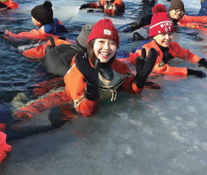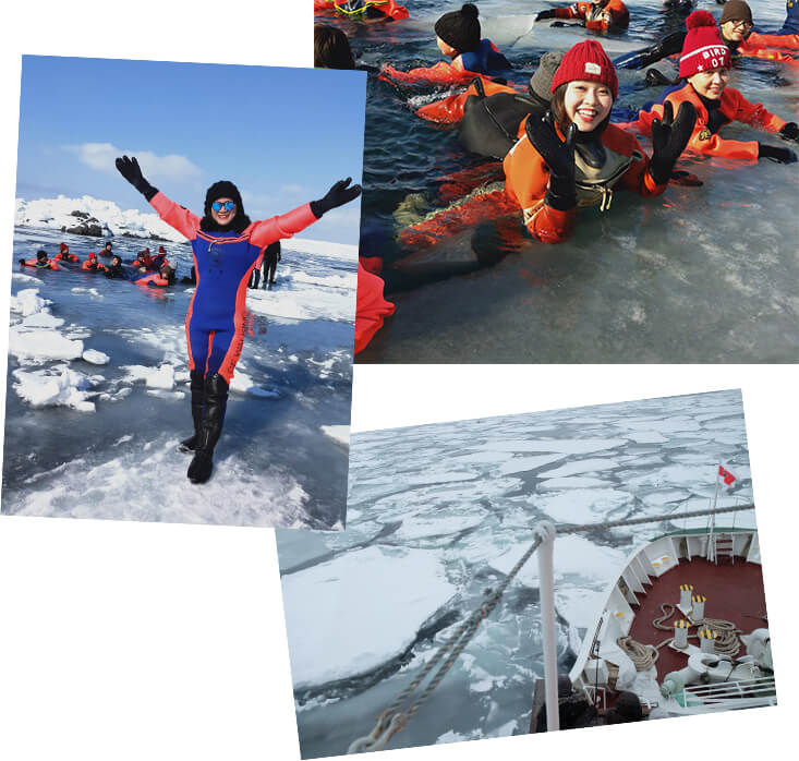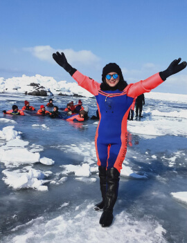 trải nghiệm mặc quần áo phao và đi bộ, bơi dưới biển băng lạnh giá.