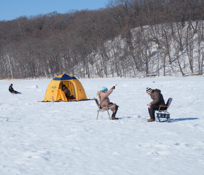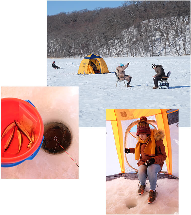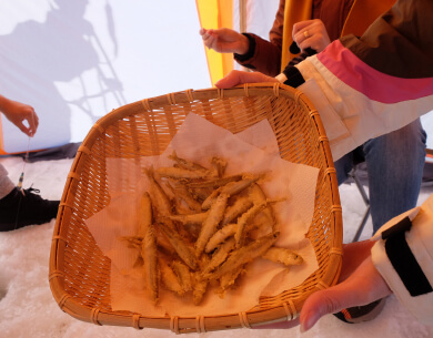 Nhân viên sẽ khoan 4 lỗ tròn đường kính 15 đến 20 cm trên lớp băng dày, cung cấp cần câu, mồi để bạn có thể câu được cá Wakasagi. Sau khi câu xong, bạn sẽ được thưởng thức món Tempura cá ngon ngọt bất ngờ.