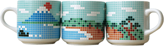 Bộ ly đáng yêu được trang trí tranh núi Phú Sĩ mang lại cảm giác vừa mới mẻ vừa gợi nhớ đến những bức tường ốp gạch ở nhà tắm công cộng (Sento) của Nhật Bản.